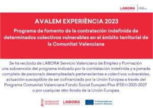 Se ha recibido de LABORA Servicio Valenciano de Empleo y Formación una subvención del programa indicado por la contratación indefinida y a jornada completa de personas desempleadas pertenecientes a colectivos vulnerables, actuación susceptible de ser cofinanciada por la Unión Europea a través del programa Comunitat Valenciana Fondo Social Europeo EXPEDIENTE ECOVUL/2023/1473/12 y por un importe de 28.728 euros
